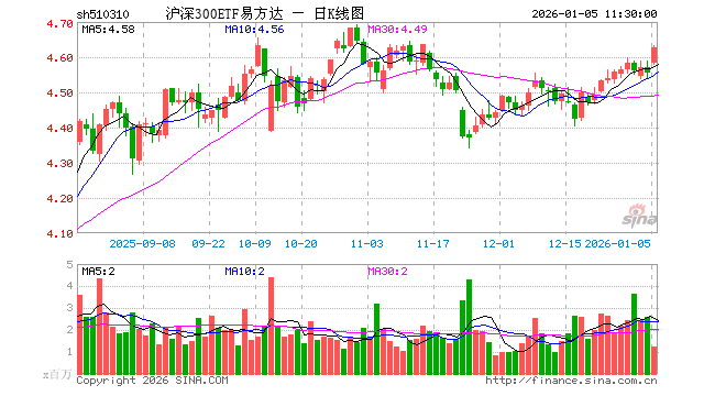 1月5日,截止午间收盘,沪深300ETF易方达(510310)涨1.58%,报4.626元,成交额5.75亿元。沪深300ETF易方达(510310)重仓股方面,宁德时代截止午盘涨1.68%,贵州茅台涨2.72%,中国平安涨5.56%,招商银行涨0.64%,紫金矿业涨1.91%,新易盛跌0.51%,中际旭创涨1.97%,美的集团涨0.88%,东方财富涨1.81%,长江电力涨0.11%。